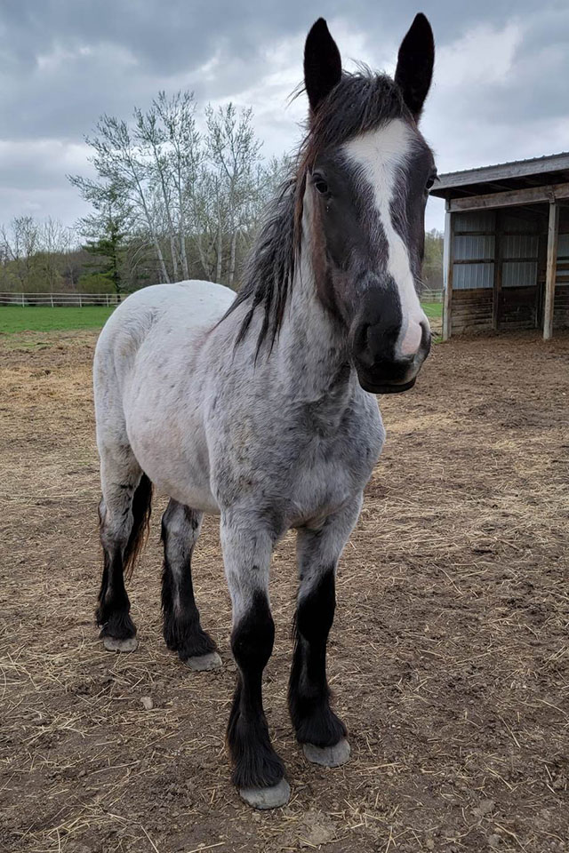 Gracie is a Drum, which is a breed first used by the Queen of England to carry heavy kettle drums. Gracie is 7 years old and, while she has been with the troupe as long as Charlie, 2023 was her first year jousting. She is Sir Edward's steed of choice, but when she's not jousting, Gracie dons wings and joins Lady Willow as a pegasus. She is a very happy-go-lucky horse and will do just about anything for a treat. Gracie likes traveling with the Knights of the New Order but also likes being back home with her daughter Lyra.
